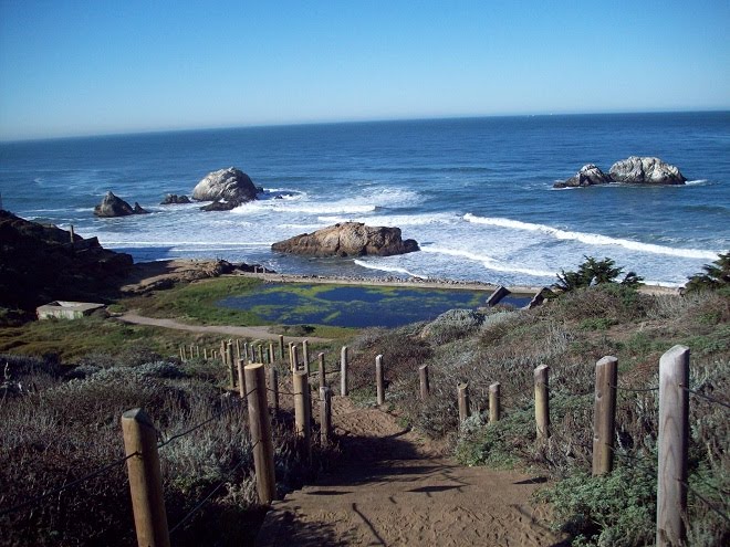 We embarked on the Land’s End walk thinking we would take in Sutro Park in addition to Land’s End. But there was a crowd assembled on Ocean Beach and our curiosity got the best of us and we went exploring. It was the ProSearch surfing competition and we got to see a couple amazing surfers doing their thing. It was a beautiful sunny day, but the Land’s End hike can be nice in the fog, too. Pictures didn’t really turn out that well of the surfing competition, so I left them out.